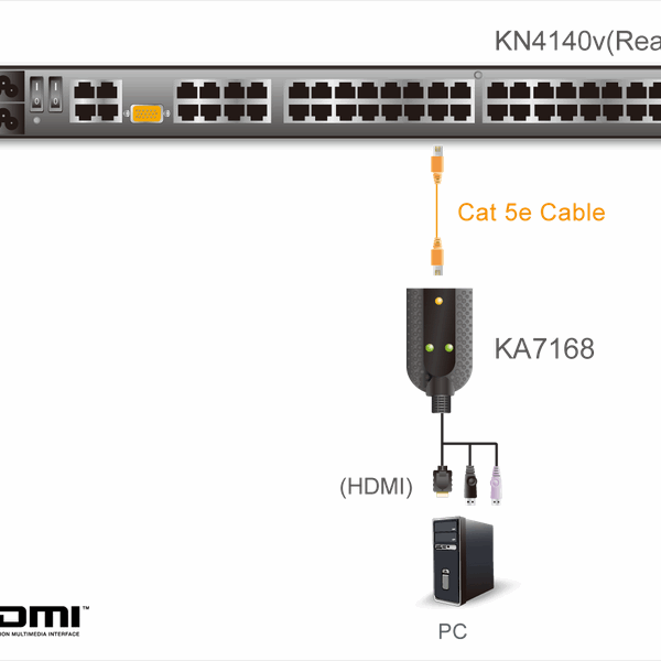 The KA7168 KVM Adapter Cable connects a KVM switch to the HDMI video and USB ports of a target computer. The KA7168 supports HDMI output and provides a USB plug to connect a target computer for Smart Card/CAC support*. With its small size and light weight design, it represents the next generation of KVM Adapter Cables – offering superior signal compensation and delay skew technologies for greatly enhanced video quality.