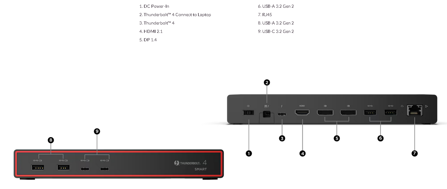 - The ThinkPad® Thunderbolt™ 4 Smart Dock 7500 with up to 40 Gbps bandwidth, you can have one Ultra-High Resolution 8K 60 Hz Displays or two 4K 144 Hz High Refresh Rate monitors set up, to fully extend your laptop to a powerful work platform with all different kinds of Peripheral Devices. It supports PD 3.1 and output up to 100W to give a fast-charge to your laptop, you can drastically expand the potential of your workspace with ease