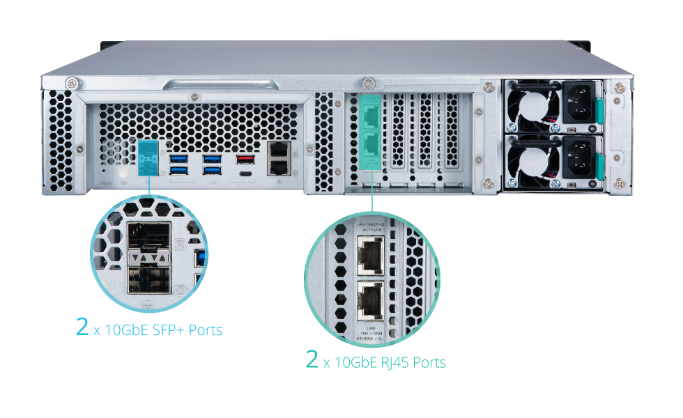 The TS-h1277XU-RP provides two Gigabit RJ45 ports, two 10GbE SFP+ ports, and comes with a dual-port 10GbE RJ45 expansion card pre-installed in a PCIe slot. The sufficient 10GbE connectivity improves overall network performance to streamline bandwidth-demanding applications, such as virtualization, large file sharing, and high-speed backup and recovery.