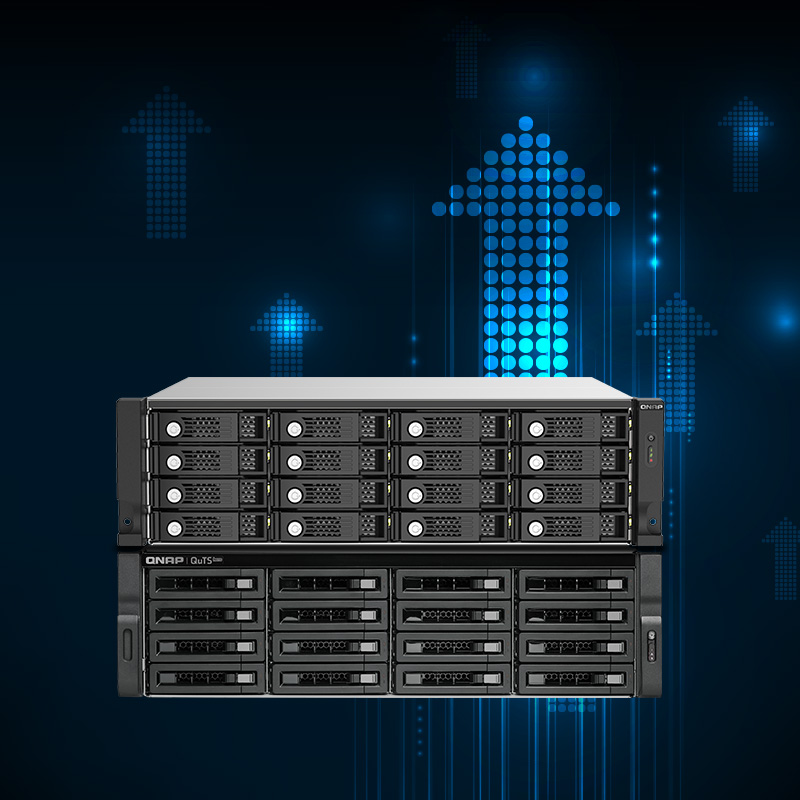 | 16-Bay QTS hero NAS, AMD Ryzen™ 7 3700X 8-core/16-thread 3.4 GHz processor, 32GB DDR4 RAM (max 128GB RAM), 16x 2.5″/3.5″ SATA HDD/SSD, 2xGbE LAN, 2 x 10GbE SFP+, 2 x 10GBase-T, USB. 3.1/3.0, 4 x PCIe expansion slot, 500W redundant power supply, QVR Pro free 8 & max 128 channels, optional graphics card support, vQTS support |