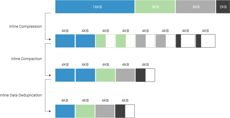 Inline data deduplication, compression, and compaction drives big data storage efficiency