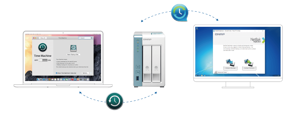 QNAP NAS provides a simple solution for backing up/restoring laptops and desktops. You can use QNAP NetBak Replicator to backup files on Windows® computers, including Outlook® Email archive. The NAS also supports Time Machine® on Mac® devices, enabling easy, fast, and convenient data backup.