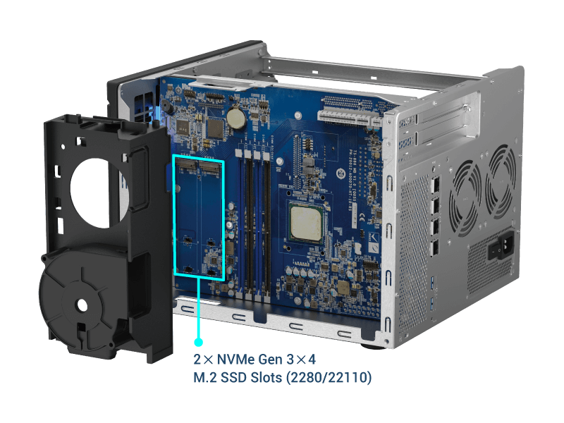 Two PCIe slots allow for 5GbE/10GbE/25GbE/40GbE adapters, QM2 cards, or entry-level graphics cards to increase application performance.
