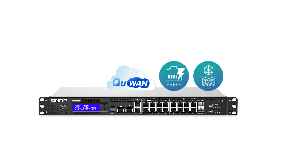 The QGD-1602P breaks through bandwidth limitations of connecting cabled and wireless networks to enhance your storage and access experience. With eight 2.5GbE ports, the QGD-1602P supplies up to 90 watts of PoE per port and a total power budget of 380 watts to meet the demands of high-power Wi-Fi 6 APs. The QGD-1602P can also be connected to a QHora Wi-Fi 6 Router via its 5GbE host ports to offer Wi-Fi 6 networking in home or office environments. Featuring diverse high-speed network interfaces, the QGD-1602P provides a comprehensive Wi-Fi 6 wireless network infrastructure solution for small-to-medium-scale businesses, hotels, and stores. Coupled with QNAP’s QuWAN SD-WAN solution, the QGD-1602P greatly enhances wireless LAN efficiency from optimized WAN bandwidth.