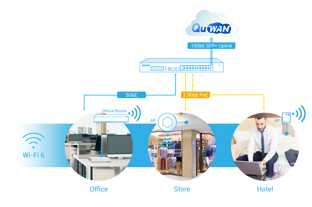 - POS System: 30-watt PoE capabilities, supports running QTS for centrally storing sales data. When used with QuWAN (an SD-WAN solution featuring IPSec VPN), staff and management can easily access an ERP system based in company headquarters/data centers.