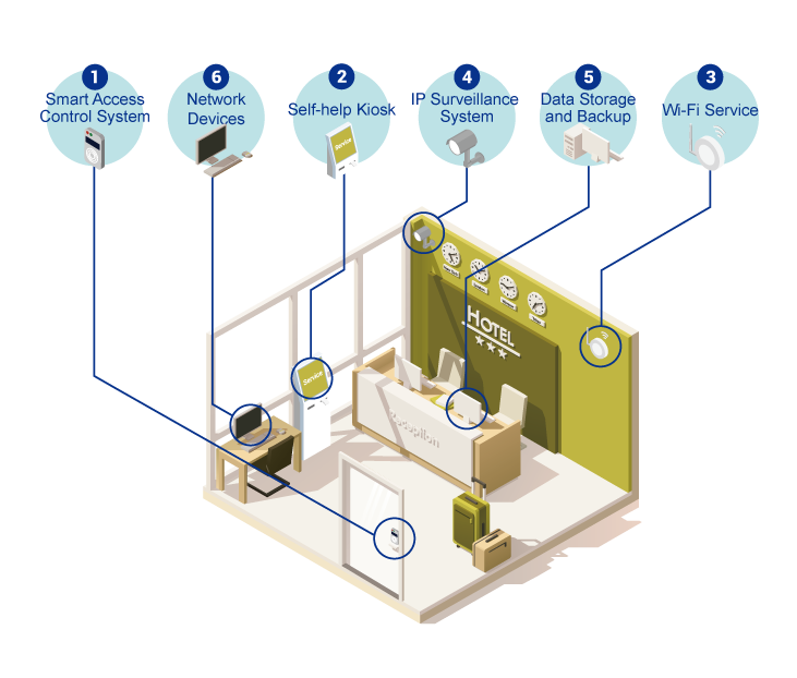 Hotel staff and customers can benefit from a smart access control system. Customers can check in with self-help kiosks upon arrival while browsing through room details and service packages. Wi-Fi should also be provided for customers to check information and contact customer service. Customer data also needs to be securely stored, while a surveillance system is necessary to ensure security.