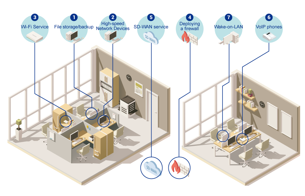 IT staff in small businesses often need to set up file servers for employees to centrally store files. You also need to create networks for connecting equipment such as printers and VoIP phones. Firewalls are crucial in information security for mitigating attacks and threats. VPN connections are also necessary for secure remote file transfers between offices, sites, and remote workers.