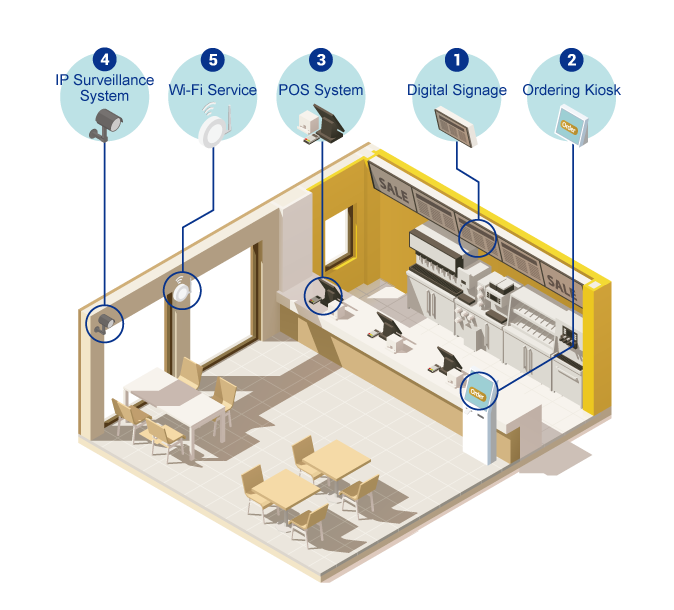 Digital signage is a convenient way to display menus/inventory and current offers. The POS system must also be constantly connected to ensure sales data is saved. An NVR surveillance system is also required to ensure customer, staff, and environmental security. These services can also use Wi-Fi for ease of use.