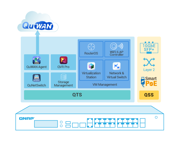 Host containerized applications and virtual machines with various operating systems. Flexibly install QuWAN, virtual router, firewalls, or wireless LAN management software for various networking management applications.