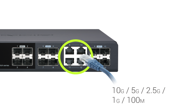 Includes four 10GbE SFP+/ RJ45 combo ports. Compatible with 10GbE and NBASE-T technologies to support five speeds (10G / 5G / 2.5G / 1G / 100M) using existing cables.