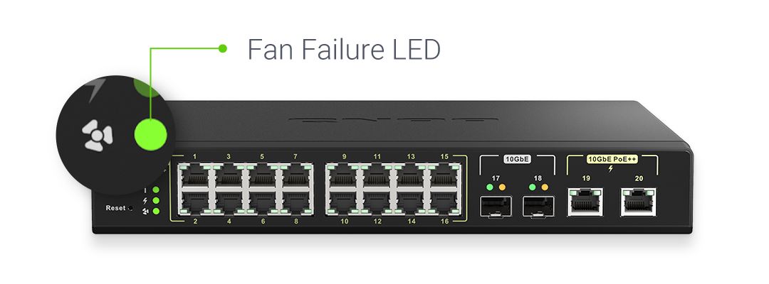 Designed for server rooms and computer rooms, the QSW-M2116P-2T2S features a standard 1U rackmount and a Fan failure LED to help IT administrators with convenient installation and efficient maintenance.