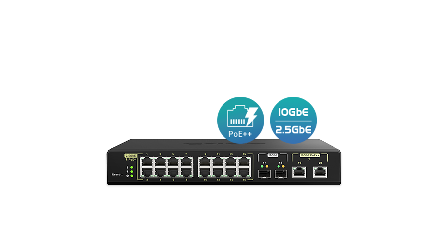 | QSW-M2116P-2T2S, 16 ports 2.5GbE RJ45 with PoE 802.3at(30W), 2 ports 10GbE SFP+, 2 ports 10GbE RJ45 with PoE 802.3bt(90W), Max PoE power consumption goes to 280W, web managed switch |