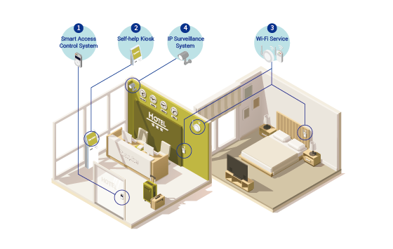Hotel staff can connect Wi-Fi 6 wireless APs and routers with the QSW-M2116P-2T2S to provide their customers with an all-new high-speed Wi-Fi 6 experience. The QSW-M2116P-2T2S can also supply PoE to powered devices of IP surveillance systems, Smart Access Control Systems and Self-help Kiosks.