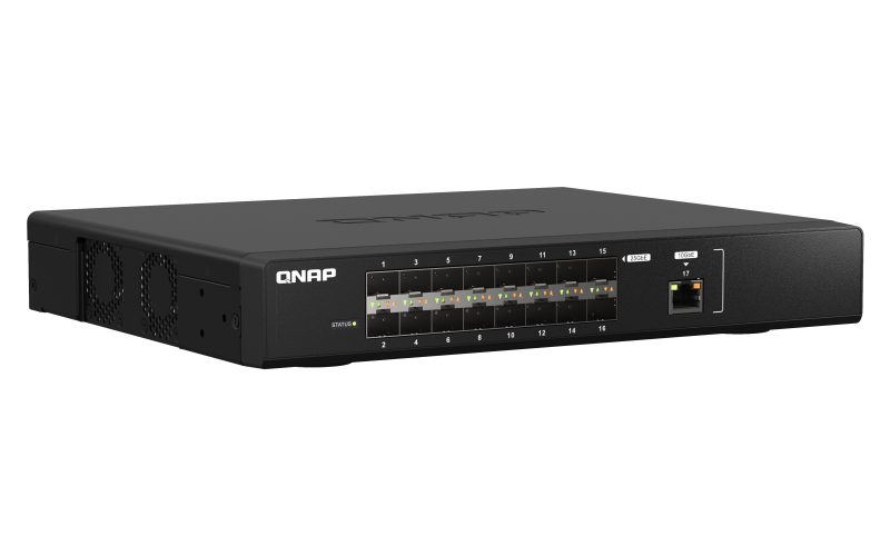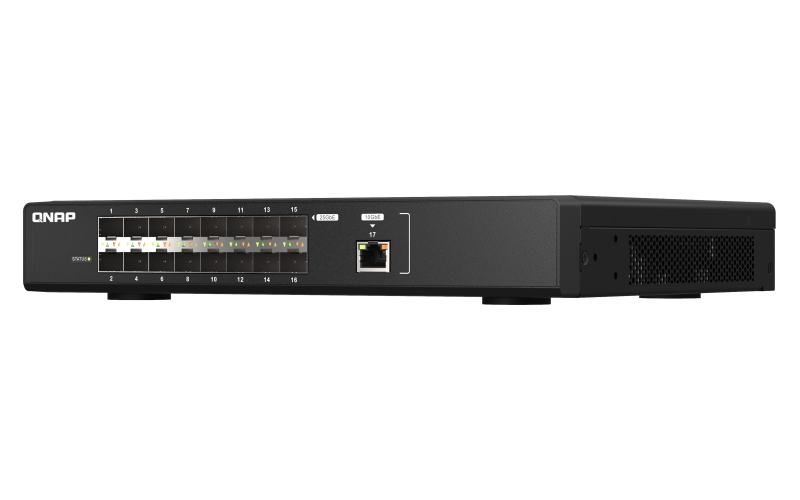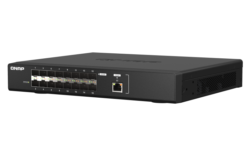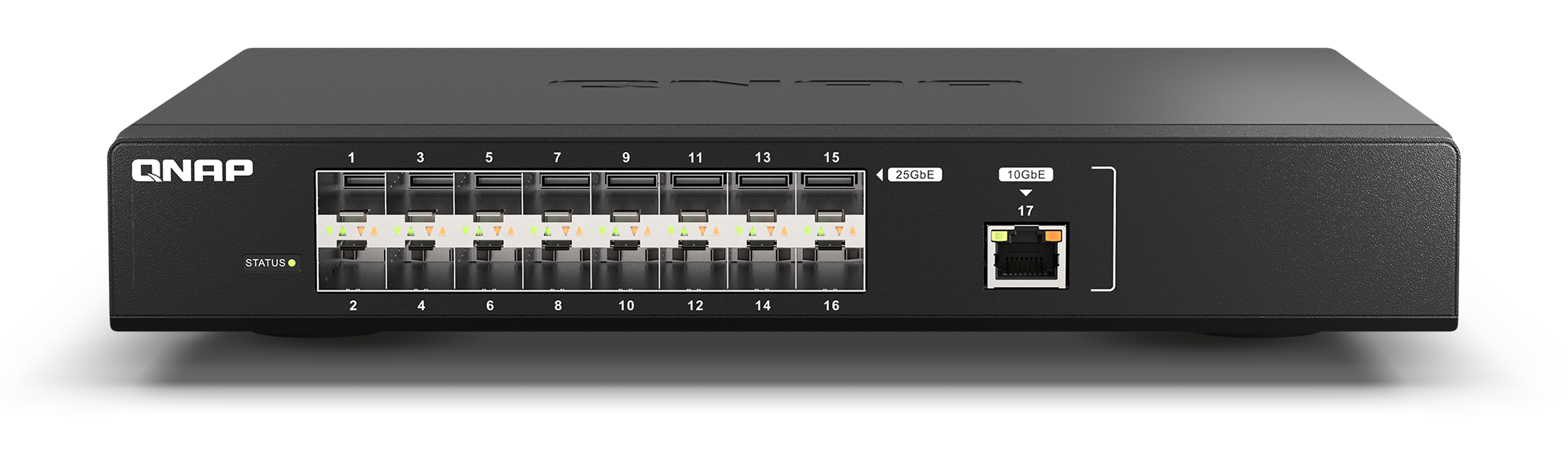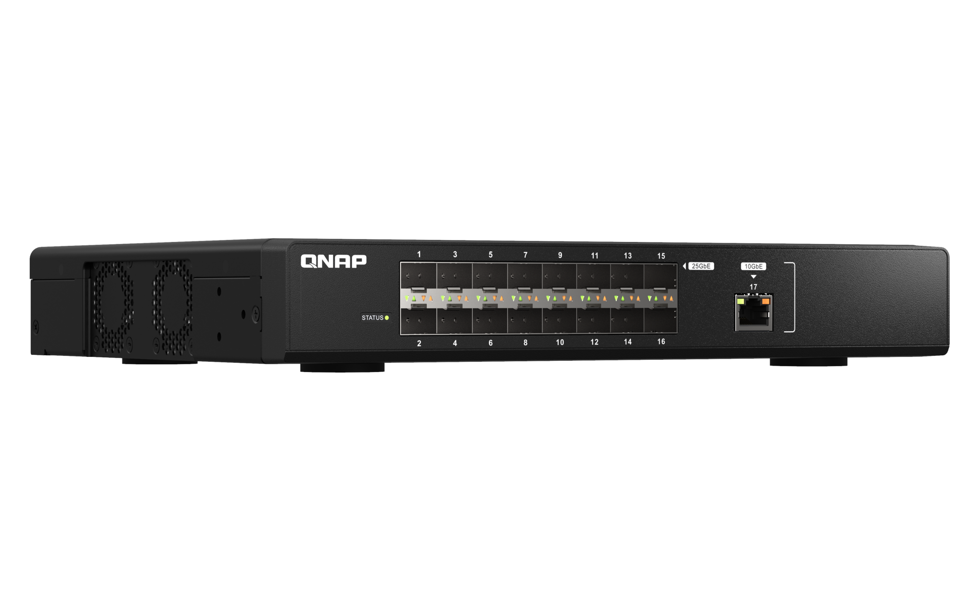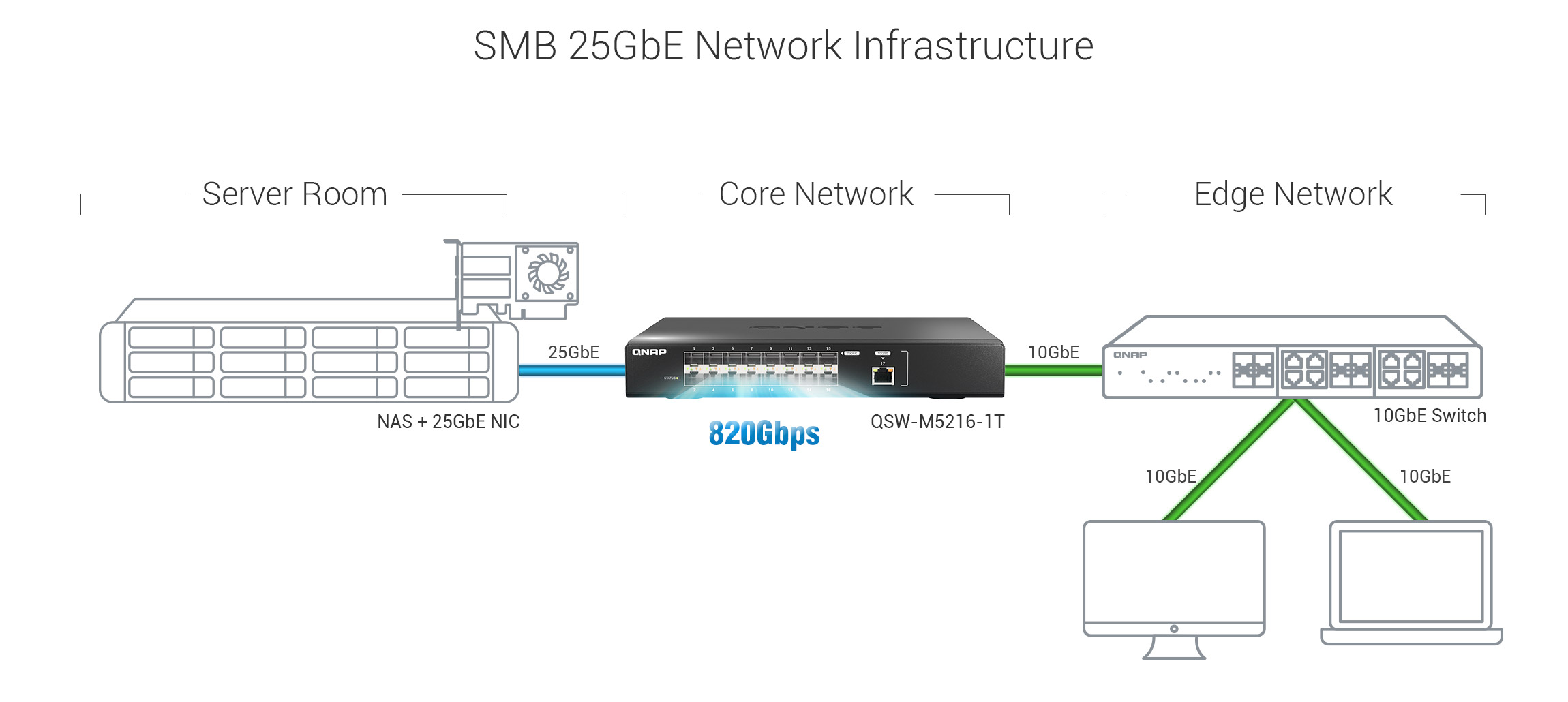The QSW-M5216-1T has sixteen 25GbE SFP28 fiber ports and offers backbone switching capacity of 820Gbps, guaranteeing the full potential of each port. The QSW-M5216-1T can serve as the core switch uplinking to 25G/100G Servers and NAS in server rooms or connecting to 25G/10G edge fiber switches.