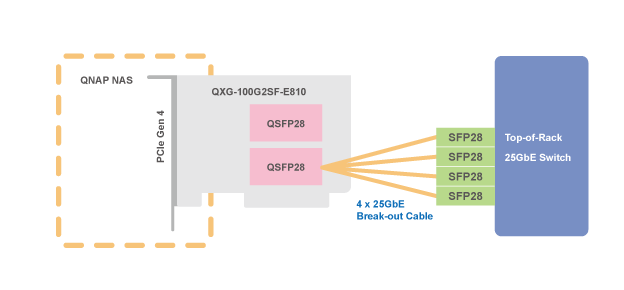 By using QSFP28 to (4) SFP28 cables, you can easily connect the four 25GbE ports on the QSW-M5216-1T to a NAS with a QXG-100G2SF-E810 dual-port 100GbE network expansion card. You can also use two QSFP28 to (4) SFP28 cables to connect the 100GbE port on the QXG-100G2SF-E810 to four 25GbE ports on the switch. Set a group of QSFP28 to (4) SFP28 connection as the main route and the other as a backup route.