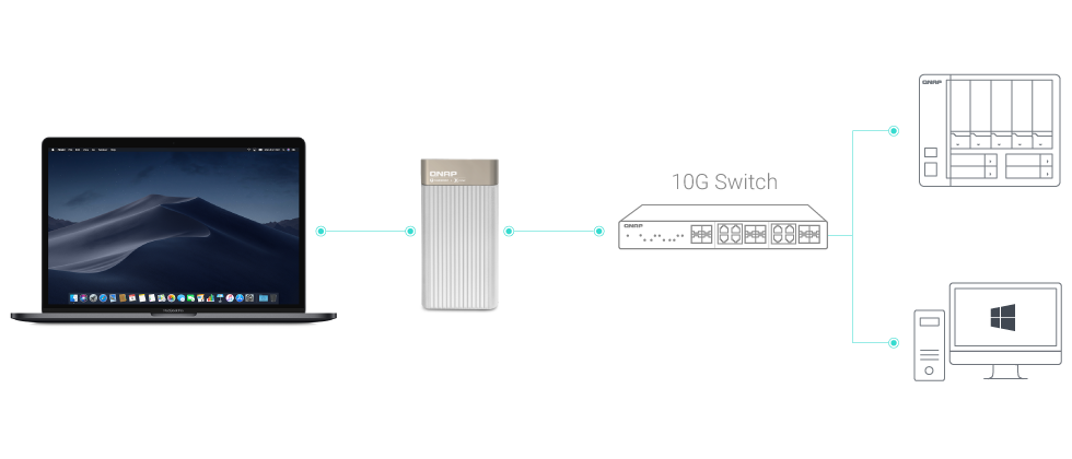 As video resolutions move from 1080p, to 4K, 8K (and beyond) media creators are struggling with the storage and network requirements needed for editing huge multimedia files. The QNA-T310G1S features one 10GbE SFP+ port, allowing you to easily add 10GbE connectivity to any Thunderbolt 3 device. Coupled with a QNAP 10GbE switch, a budget-friendly 10GbE environment can be created for creative studios to benefit from the incredible speed and bandwidth that 10GbE provides.