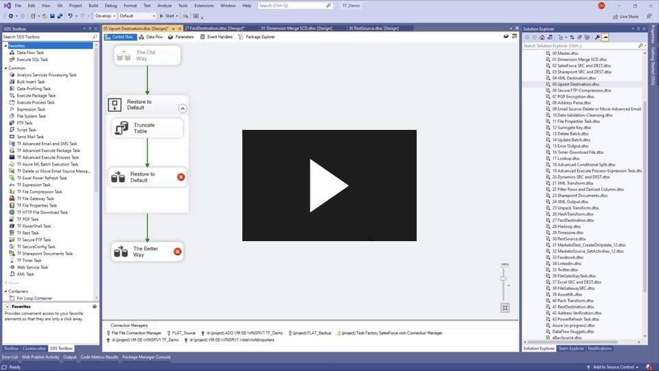 Development teams often face trade-offs between programming efficiency and application performance. With Task Factory, you can both eliminate needless programming of SSIS components and improve the efficiency of your data-centric applications in production. Productivity components include Secure FTP Task, data cleansing components such as the Null Handler, and more.