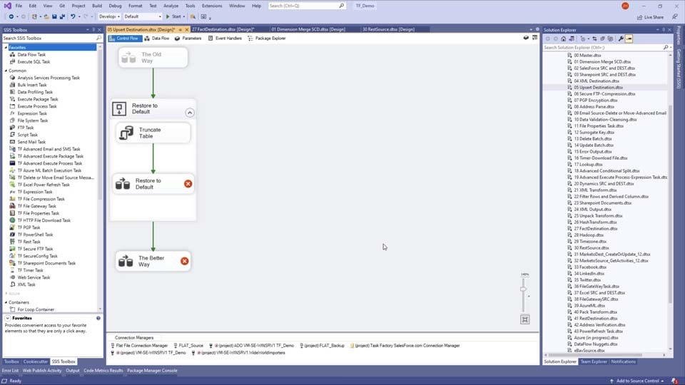 Accelerate performance of your data-centric applications with Task Factory high-performance components, including the Upsert Destination, which speeds batch processing, and the Dimension Merge SCD, which is a high-performance replacement for the Slow Changing Dimension wizard in SSIS.