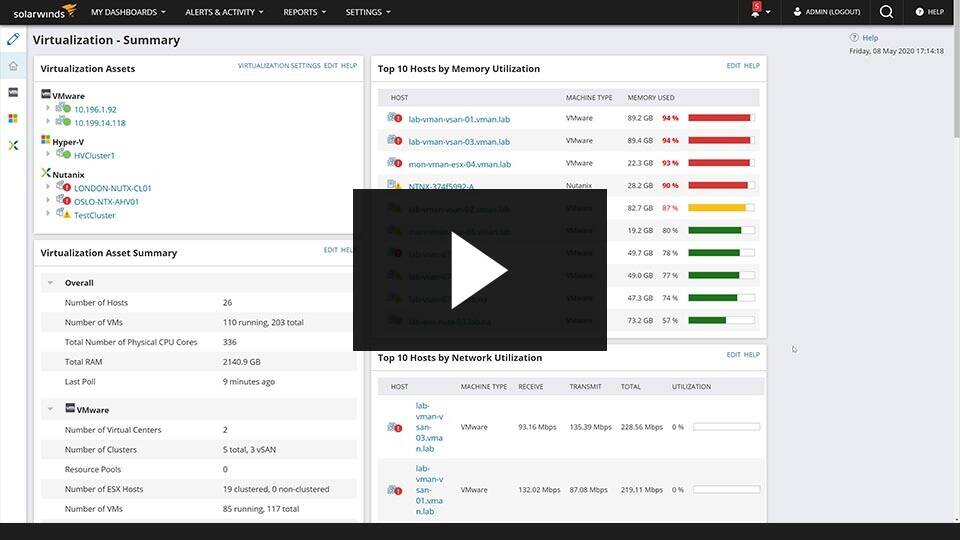 SolarWinds Virtualization Manager (VMAN) is designed to be an intuitive tool for virtualization monitoring, performance management, capacity planning, and optimization across VMware® vSphere, Microsoft® Hyper-V, and Nutanix® AHV environments. Virtualization Manager is affordable and easy to download, deploy, and use.