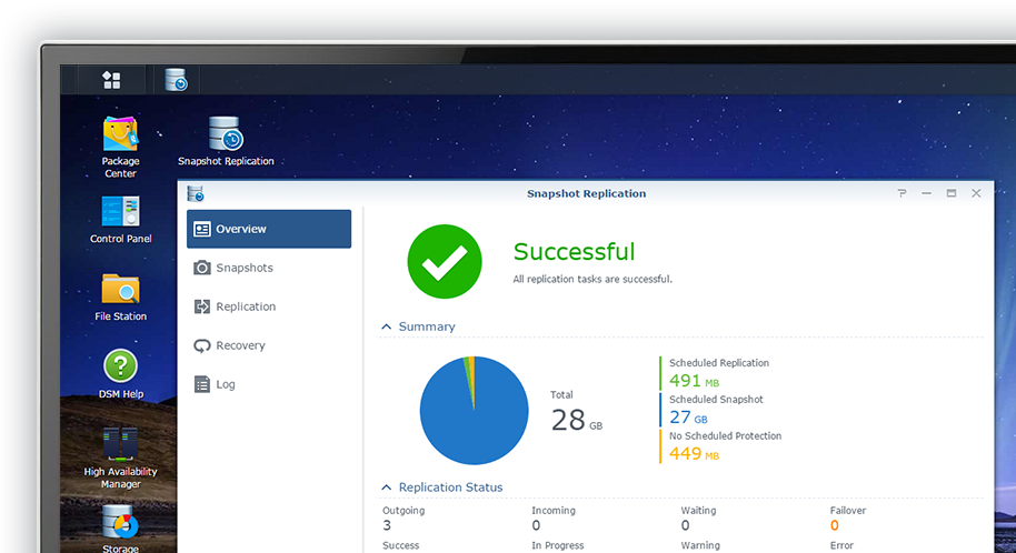 The built-in Snapshot Replication application reproduces 65,000 backup copies to offsite servers, bringing near-instantaneous data protection and ensuring data in shared folders or virtual machines in iSCSI LUNs remain available in the event of disaster.